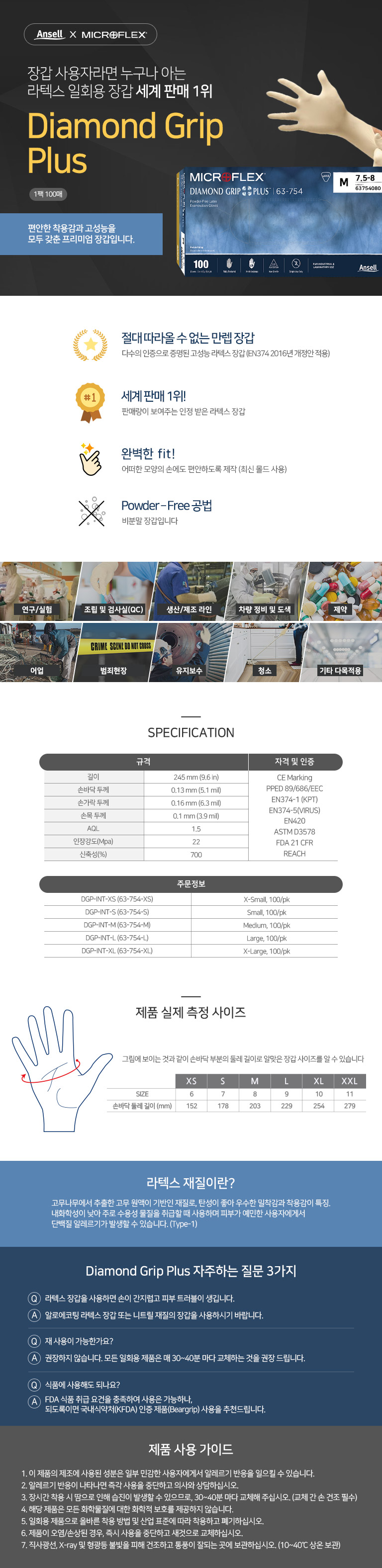 • ANSELL MICROFLEX 63-754-M / 63-754 Diamond Grip Plus 일회용 라텍스 장갑 Medium (DGP-INT-M), 240mm[100EA/PK]