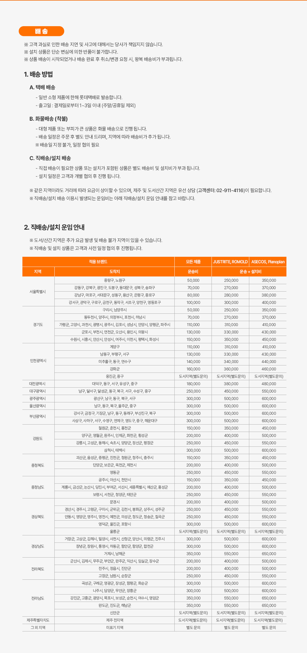 • 택배 배송을 기본으로 하며, 상품 특성 및 주문자의 요청에 따라 화물 배송이 가능합니다.
