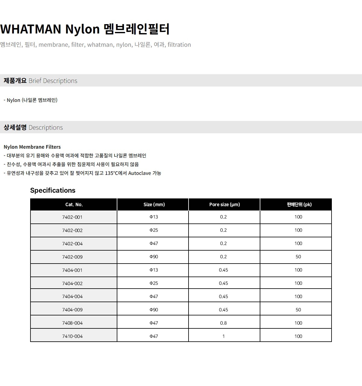 • CYTIVA WHATMAN 7404-004 /  Nylon 멤브레인 필터(Membrane Filter), 47mm 0.45µm[100EA/PK]