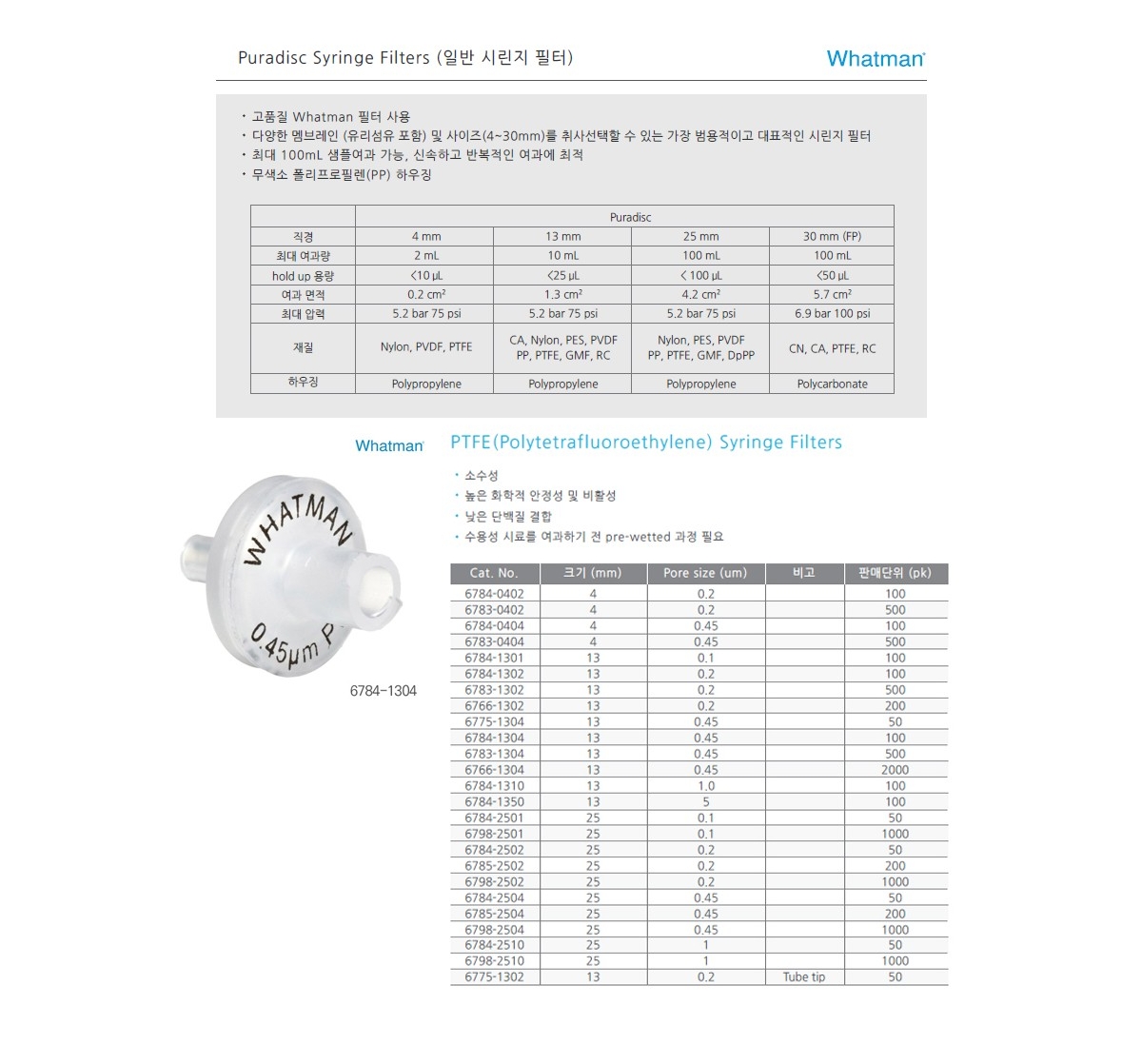 이미지 확대보기CYTIVA WHATMAN 6784-1302 / Puradisc 시린지 필터(Syringe Filter), PTFE 13mm 0.2µm[100EA/PK]
