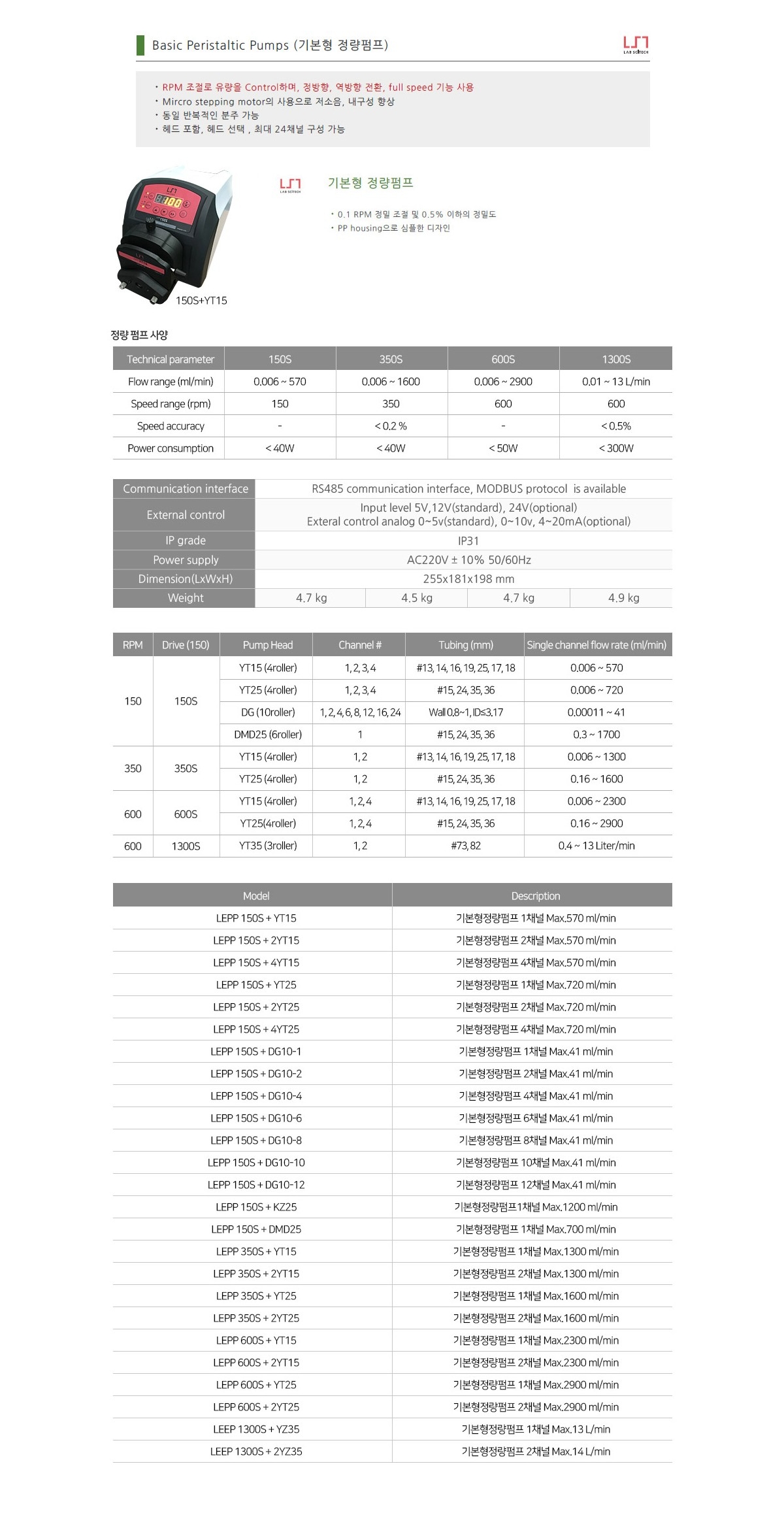 • LST-LeadFluid LEPP150S+YT15 / 정량펌프(Peristaltic Pump) 기본형 1채널 ,150rpm, Max.570ml/min[1EA]