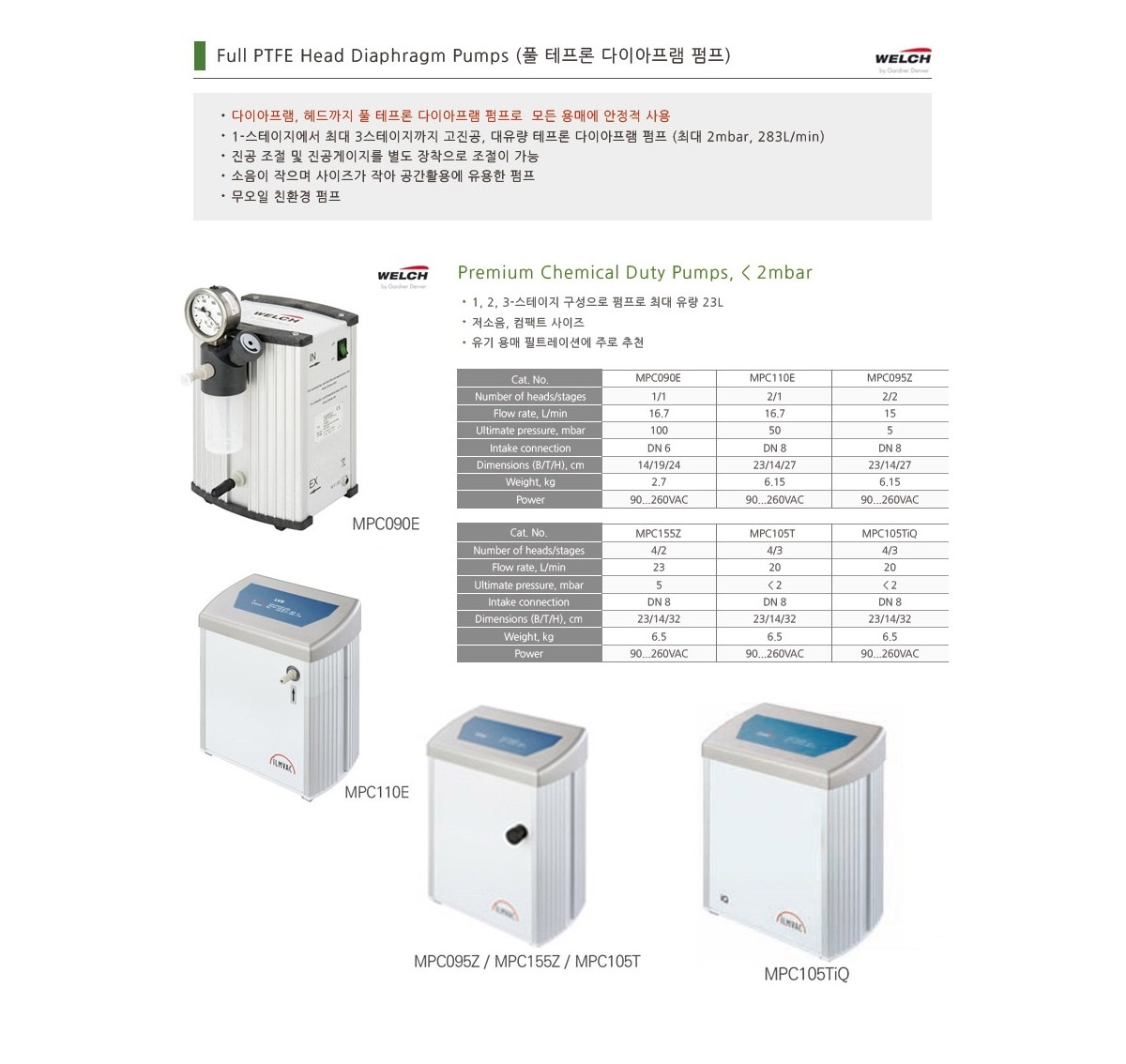 Welch MPC105T / 풀 테프론 다이아프램 진공 펌프 (Full PTFE Diaphragm Vacuum Pump) 20L/min 2mbar[1EA] 3,751,000원 / 배송비 : 3,000원