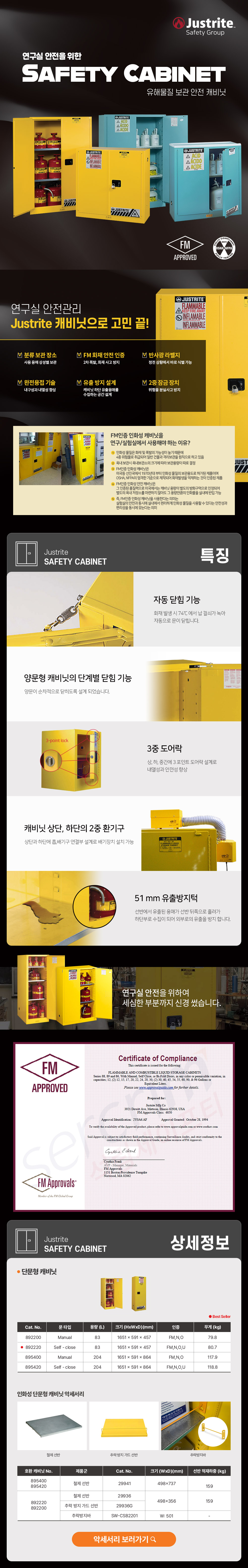 이미지 확대보기Justrite 892220 / FM인증 인화성 물질 안전보관 캐비닛 22갤런 단문형 자동닫힘/슬림형 (철제/83L/노랑)/591x457x1651mm/선반3개/80.7kg[1EA]
