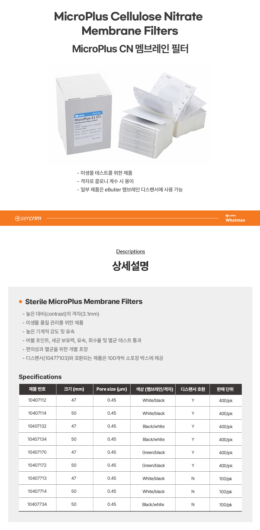 CYTIVA WHATMAN 10407713 / CN 멤브레인 필터(Membrane Filter), 47mm 0.45?m, 멸균, 3.1mm WT/BK 격자, Cellulose Nitrate[100EA/PK]