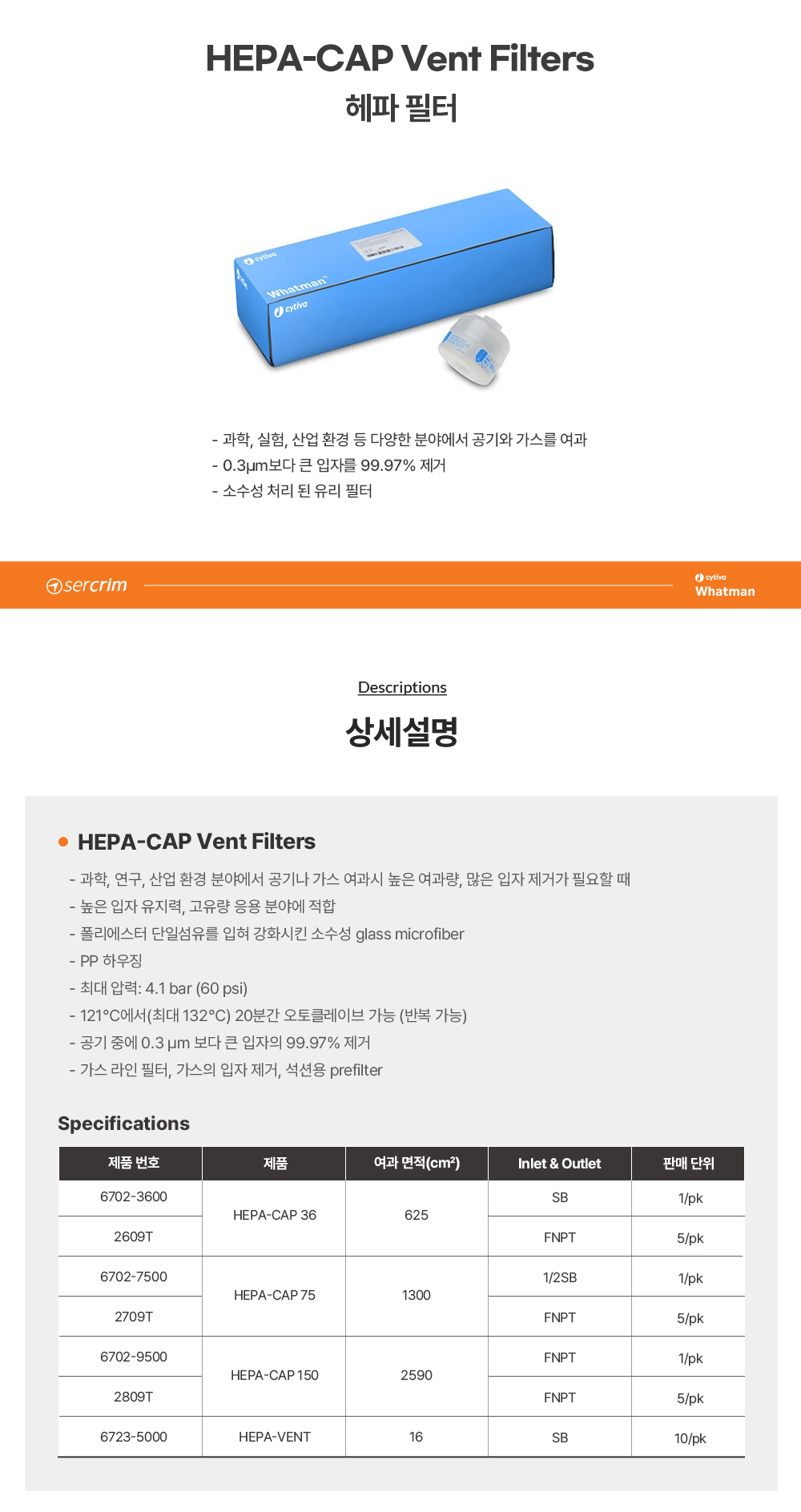 • CYTIVA WHATMAN 2809T / HEPA-CAP 150공기/가스 여과용 필터(Vent Filter), FNPT-FNPT[5EA/PK]
