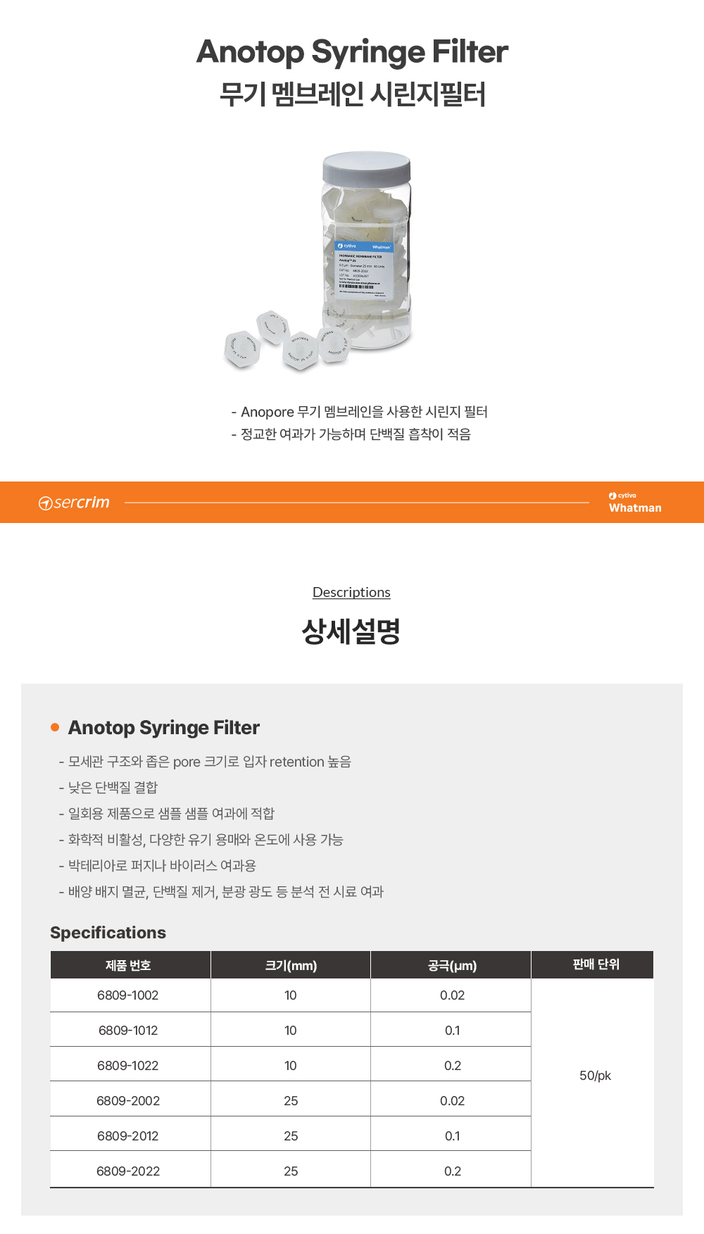 이미지 확대보기CYTIVA WHATMAN 6809-1022 / Anotop 시린지 필터(Syringe Filter), 10mm 0.2?m[50EA/PK]