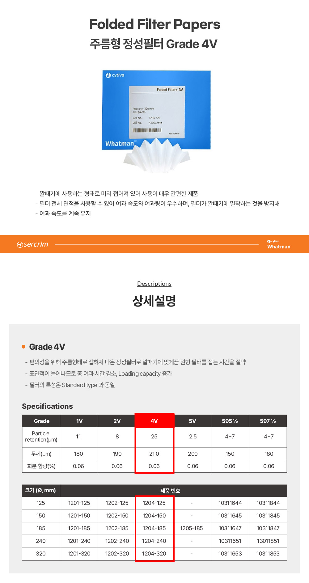 CYTIVA WHATMAN 1204-0185 / Grade 4V 정성 필터 (Qualitative Filter Paper), 주름형, 185mm[100EA/PK	]