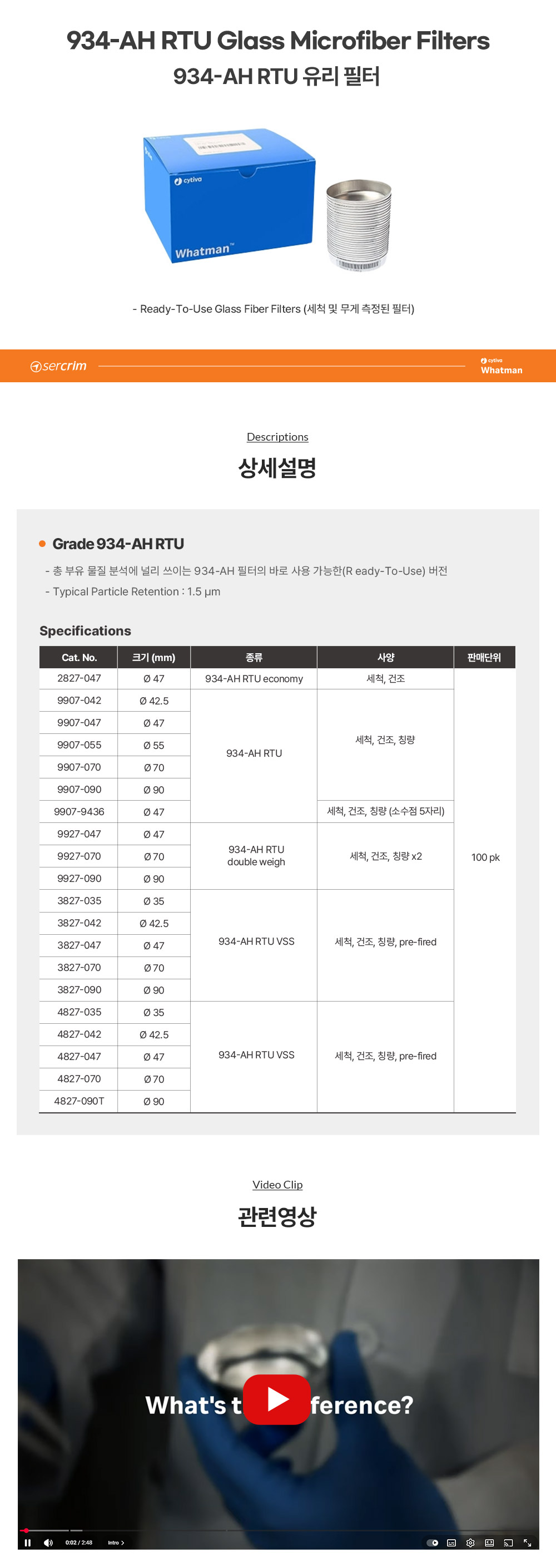 CYTIVA WHATMAN 4827-090 / 934-AH Ready To Use VSS용 유리섬유 필터(Glass Microfiber Filter), 세척/건조/pre-fired, 90mm[100EA/PK]