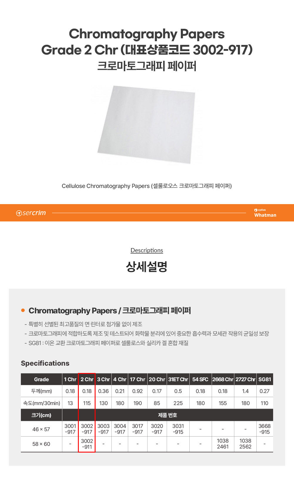 • CYTIVA WHATMAN 3002-911 / Grade 2 Chr 크로마토그래피 종이(Chromatography Paper), 580x600mm[100EA/PK]