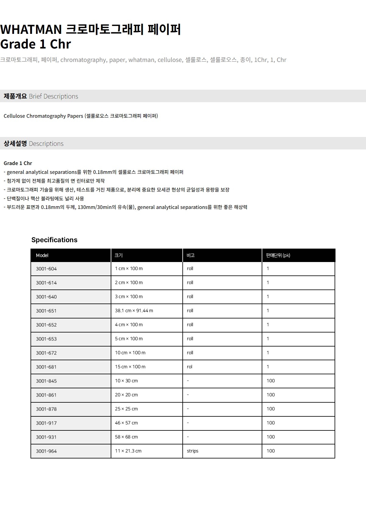 CYTIVA WHATMAN 3001-964 / Grade 1 Chr 크로마토그래피 종이(Chromatography Paper), 12 strip line, 110x213mm[100EA/PK] 346,500원 / 배송비 : 3,000원