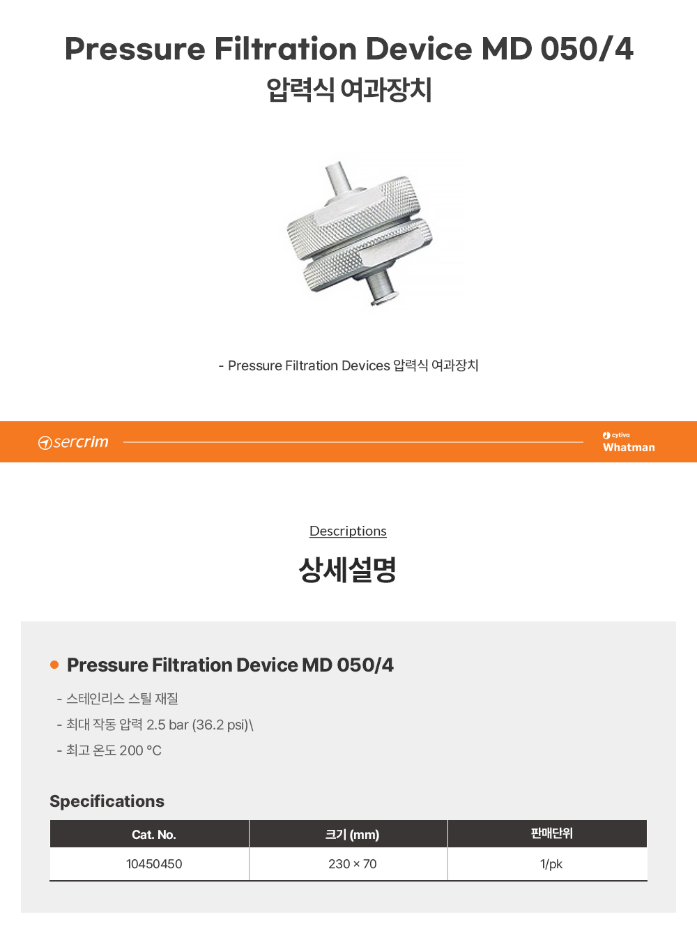 이미지 확대보기CYTIVA WHATMAN 10453007 / Pressure Filtration Device MD050/0/18 CONN HOSE 9MM[1EA/PK ]