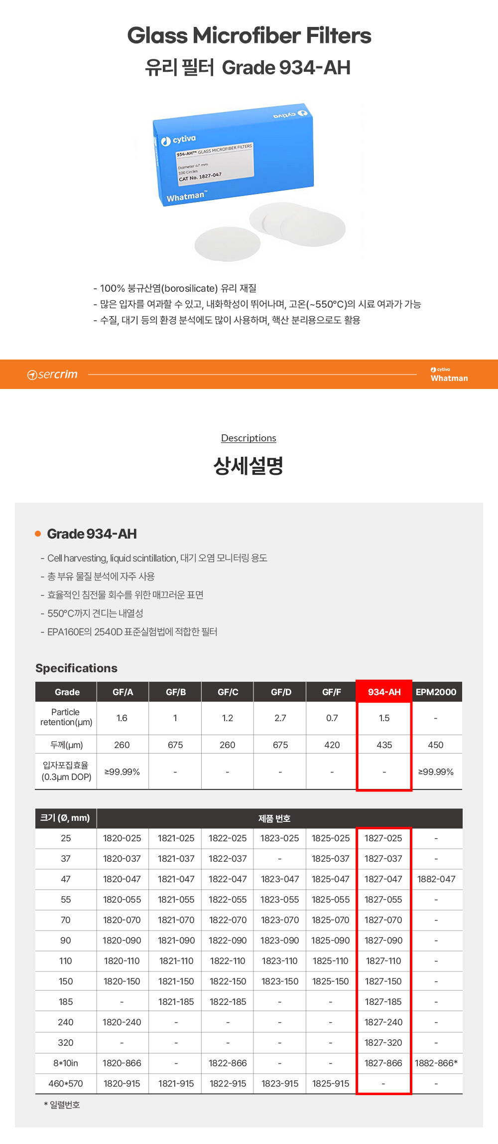 • CYTIVA WHATMAN 1827-185 /  934-AH 유리섬유 필터(Glass Microfiber Filter), 185mm[100EA/PK	]