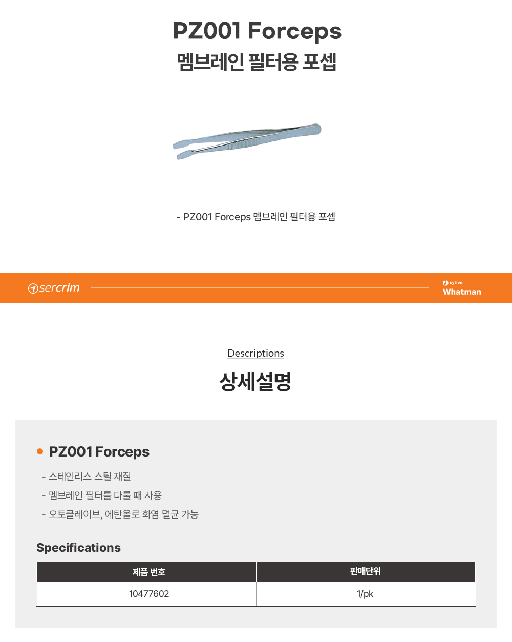 • CYTIVA WHATMAN 10477602 /  PZ 001, 스테인리스 스틸 Tweezers[1EA/PK]