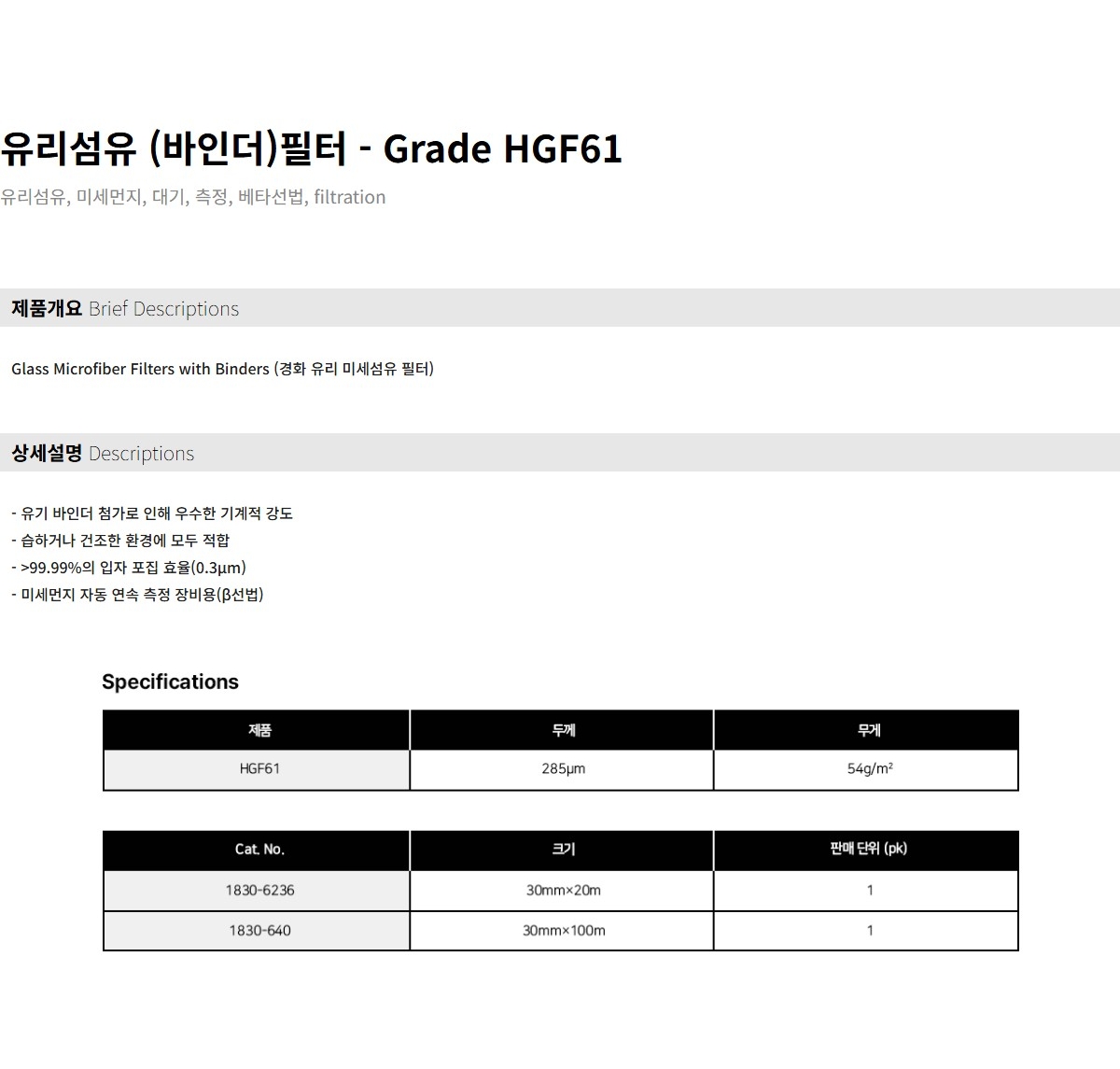 CYTIVA WHATMAN 1830-6236 / HGF61 유리섬유 필터(Glass Microfiber Filter), 30mmx20m, core 40.5mm[1EA/PK] 157,300원 / 배송비 : 3,000원