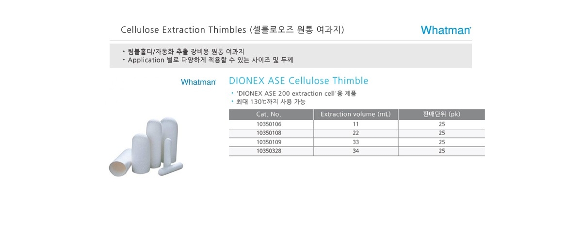 CYTIVA WHATMAN 10350106 / DIONEX ASE용 셀룰로스 원통 여과지(Cellulose Thimble Filter), 11mL, 두께 1.0mm[25EA/PK] 310,200원 / 배송비 : 3,000원