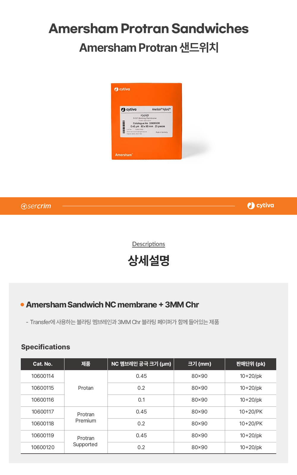 • CYTIVA WHATMAN 10600119 / Amersham Protran 블라팅 멤브레인(Blotting Membrane), Sandwich, Supported, NC 0.45µm+3MM, 80x90mm[10EA/PK	]