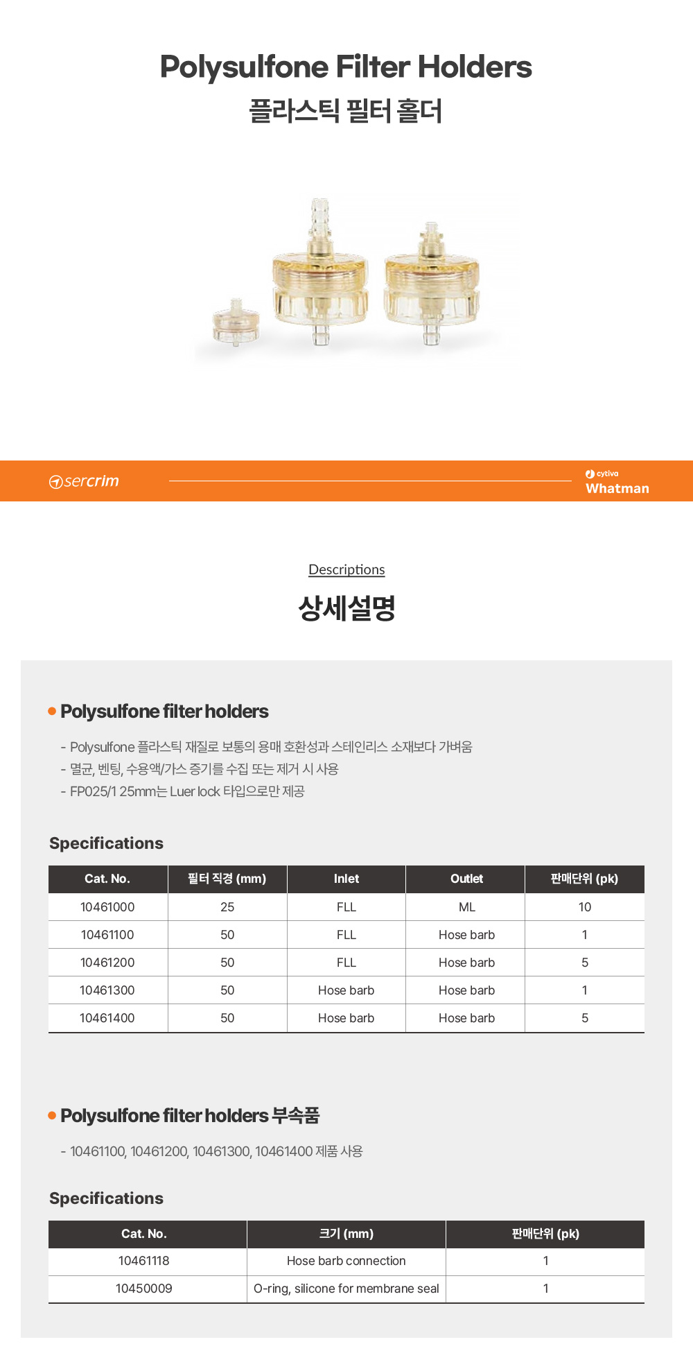 • CYTIVA WHATMAN 10461200 / FP050/0 Polysulfone 필터 홀더(filter holders), 50mm, FLL-Hose barb[단종	]