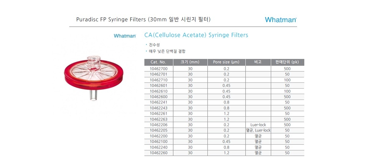 • CYTIVA WHATMAN 10462263 / Puradisc FP 시린지 필터(Syringe Filter), CA 30mm 1.2μm[500EA/PK]