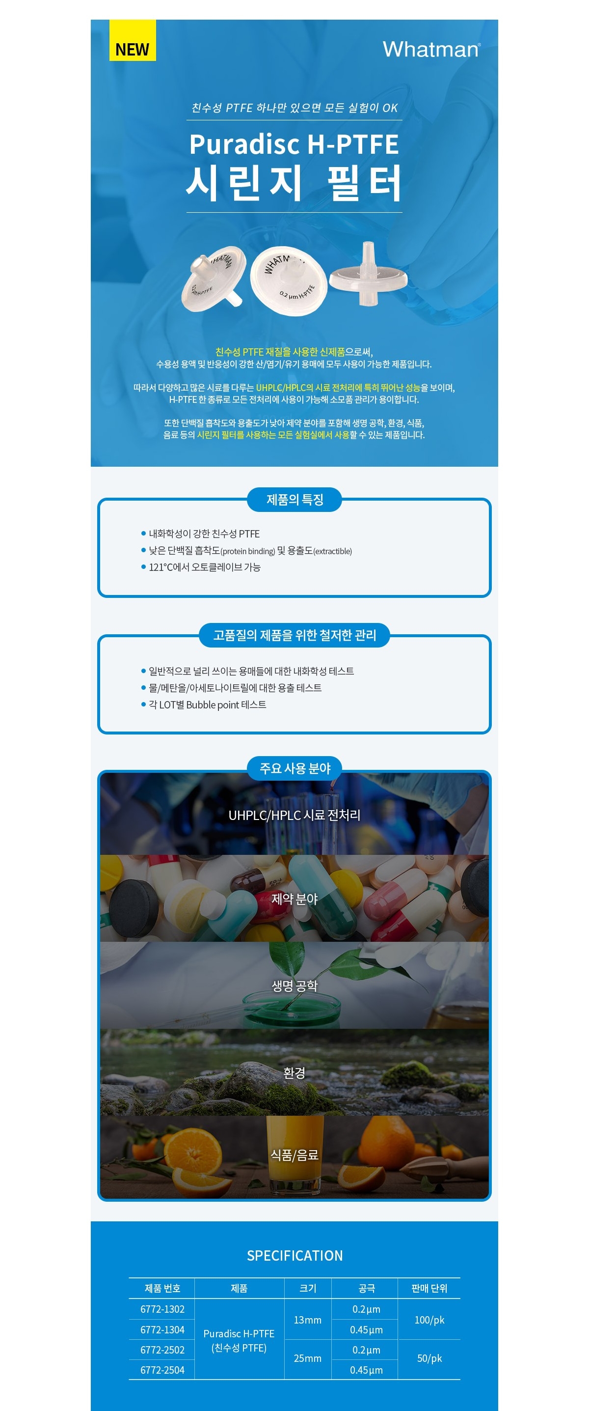이미지 확대보기CYTIVA WHATMAN 6772-2502 / Puradisc 시린지 필터(Syringe Filter), H-PTFE 25mm 0.2μm[50EA/PK]