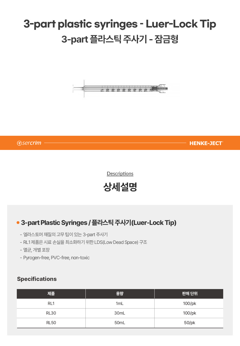 • HENKE-JECT RL1 / 플라스틱 실험용 주사기(syringe), 1mL, Luer-Lock Tip (잠금형), 멸균, 8300018745[100EA/PK]