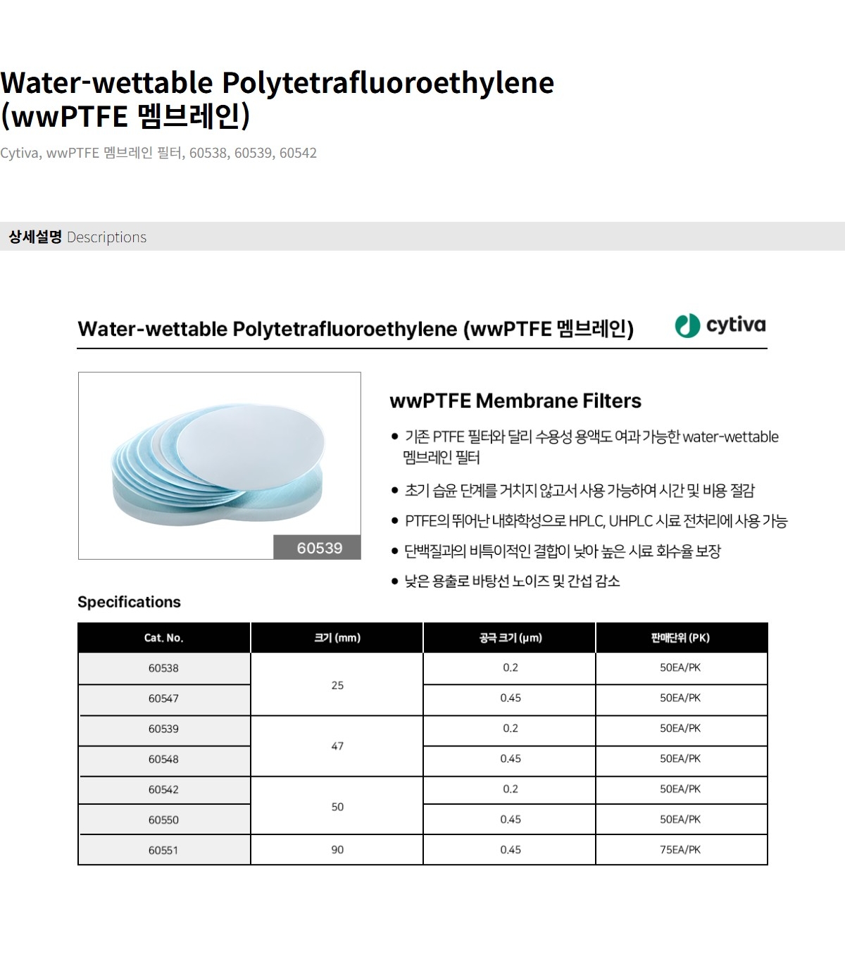 Pall 60538 / wwPTFE 멤브레인 필터(Membrane Filter), 25mm 0.2µm,Water-wettable PTFE[50EA/PK] 별도문의 / 배송비 : 3,000원