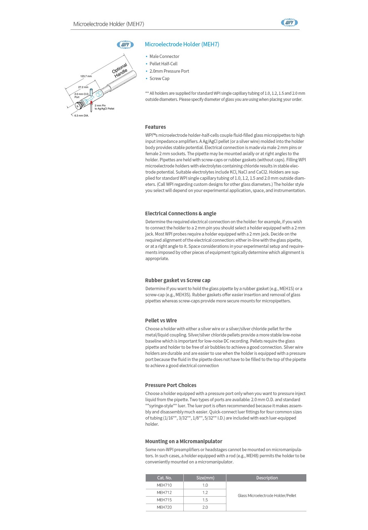 WPI MEH710 / 마이크로전극 홀더 (Microelectrode Holder), MEH7, 1.0MM[단종]